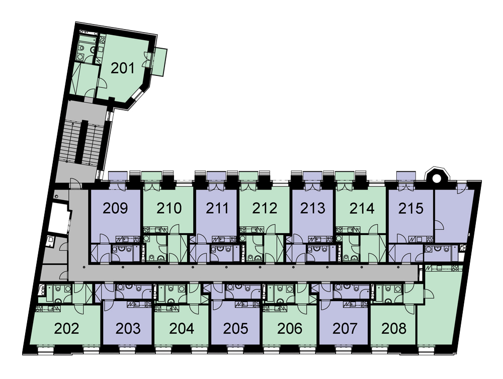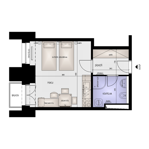 Pronájem zařízeného bytu 1+kk v prvním patře o celkové výměře 29,55 m2. Zádveří 5,63 m2, koupelna 4,17 m2, pokoj s kuchyňským koutem 18,20 m2, balkon 1,55 m2. Okna jsou situovány na jižní stranu do dvorní části objektu. Vybavení bytu tvoří kuchyňský kout s kuchyňskou linkou v barvě Wenge a pracovní deskou Egger v barvě Jura černá se sklokeramickou varnou deskou Indesit VRM 640 MC se čtyřmi varnými zónami, komínový odsavač Elica Missy 60/IX, vestavěná mikrovlná trouba Baumatic BMC253SS s grilem a horkovzdušnou troubou, podstavná lednice indesit TFAA 10. Jídelní stůl + 2 židle. Pracovní stůl a židle, dvě postele 90 x 200 cm barva Wenge, které jdou sestavit samostatně, nebo jako dvojlůžko. V předsíni je vestavěná skříň. Koupelna se sprchovým koutem 90 x 90 cm, umyvadlem a WC, koupelnová skříňka LeBon, barva Wenge. Topení ústřední s radiátory, ohřev teplé vody elektrickým inteligentním ohřívačem OKHE SMART se zásobníkem teplé vody pro 100 l. Bytová okna s izolačními trojskly.