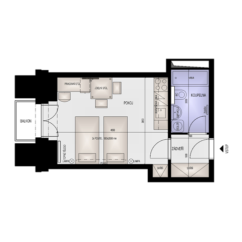 Pronájem zařízeného bytu 1+kk v druhém patře o celkové výměře 26,61 m2. Zádveří 2,88 m2, koupelna 4,24 m2, pokoj s kuchyňským koutem 17,94 m2, balkon 1,55 m2. Okna jsou situovány na jižní stranu do dvorní části objektu. Vybavení bytu tvoří kuchyňský kout s kuchyňskou linkou v barvě Wenge a pracovní deskou Egger v barvě Jura černá se sklokeramickou varnou deskou Indesit VRM 640 MC se čtyřmi varnými zónami, komínový odsavač Elica Missy 60/IX, vestavěná mikrovlná trouba Baumatic BMC253SS s grilem a horkovzdušnou troubou, podstavná lednice indesit TFAA 10. Jídelní stůl + 2 židle. Pracovní stůl a židle, dvě postele 90 x 200 cm barva Wenge, které jdou sestavit samostatně, nebo jako dvojlůžko. V předsíni je vestavěná skříň. Koupelna s vanou 150 cm, umyvadlem a WC, koupelnová skříňka LeBon, barva Wenge. Topení ústřední s radiátory, ohřev teplé vody elektrickým inteligentním ohřívačem OKHE SMART se zásobníkem teplé vody pro 100 l. Bytová okna s izolačními trojskly.