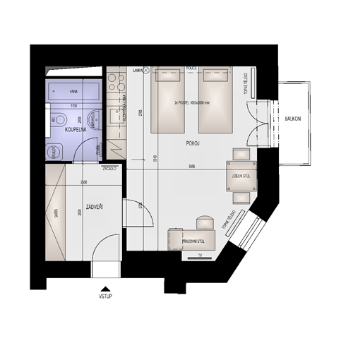 Pronájem zařízeného bytu 1+kk v čtvrtém patře o celkové výměře 38,24 m2. Zádveří 6,76 m2, koupelna 4,25 m2, pokoj s kuchyňským koutem 24,53 m2, balkon 2,7 m2. Okna jsou situovány na západní stranu do dvorní části objektu. Vybavení bytu tvoří kuchyňský kout s kuchyňskou linkou v barvě Wenge a pracovní deskou Egger v barvě Jura černá se sklokeramickou varnou deskou Indesit VRM 640 MC se čtyřmi varnými zónami, komínový odsavač Elica Missy 60/IX, vestavěná mikrovlná trouba Baumatic BMC253SS s grilem a horkovzdušnou troubou, podstavná lednice indesit TFAA 10. Jídelní stůl + 2 židle. Pracovní stůl a židle, dvě postele 90 x 200 cm barva Wenge, které jdou sestavit samostatně, nebo jako dvojlůžko. V předsíni je vestavěná skříň. Koupelna s vanou 150 cm, umyvadlem a WC, koupelnová skříňka LeBon, barva Wenge. Topení ústřední s radiátory, ohřev teplé vody elektrickým inteligentním ohřívačem OKHE SMART se zásobníkem teplé vody pro 100 l. Bytová okna s izolačními trojskly.