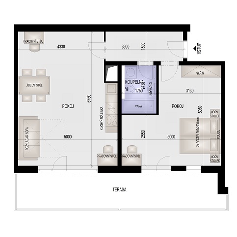 Pronájem zařízeného bytu 2+kk v šestém patře o celkové výměře 86,29 m2. Byt je vybaven klimatizační jednotkou Samsung, včetně dálkového ovládání. Chodba 5,85 m2, koupelna 4,24 m2, pokoj s kuchyňským koutem 31,99 m2, ložnice 20,55 m2, šatna 4,03 m2, terasa 19,63m2. Okna jsou situovány na západní stranu do vnitřního dvora. Vybavení bytu tvoří obývací pokoj s kuchyňským koutem s kuchyňskou linkou a pracovní deskou se sklokeramickou varnou deskou Mora se čtyřmi varnými zónami, komínový odsavač Elica Missy 60/IX, vestavěná mikrovlnná trouba Philco s grilem a horkovzdušnou troubou, podstavná lednice Philco. Jídelní stůl + 4 židle. Pracovní stůl a židle. Pohodlné rozkládací sofa. V samostatné ložnici jsou dvě luxusní postele 90 x 200 cm s matrací King Koil, které jdou sestavit samostatně, nebo jako dvojlůžko. V předsíni je vestavěná šatní skříň. Koupelna s vanou, umyvadlem a WC, koupelnová skříňka a topný žebřík. Topení ústřední s radiátory, ohřev teplé vody elektrickým inteligentním ohřívačem OKHE SMART se zásobníkem teplé vody pro 125 l. Bytová okna s izolačními trojskly. Prostorná terasa s posezením.